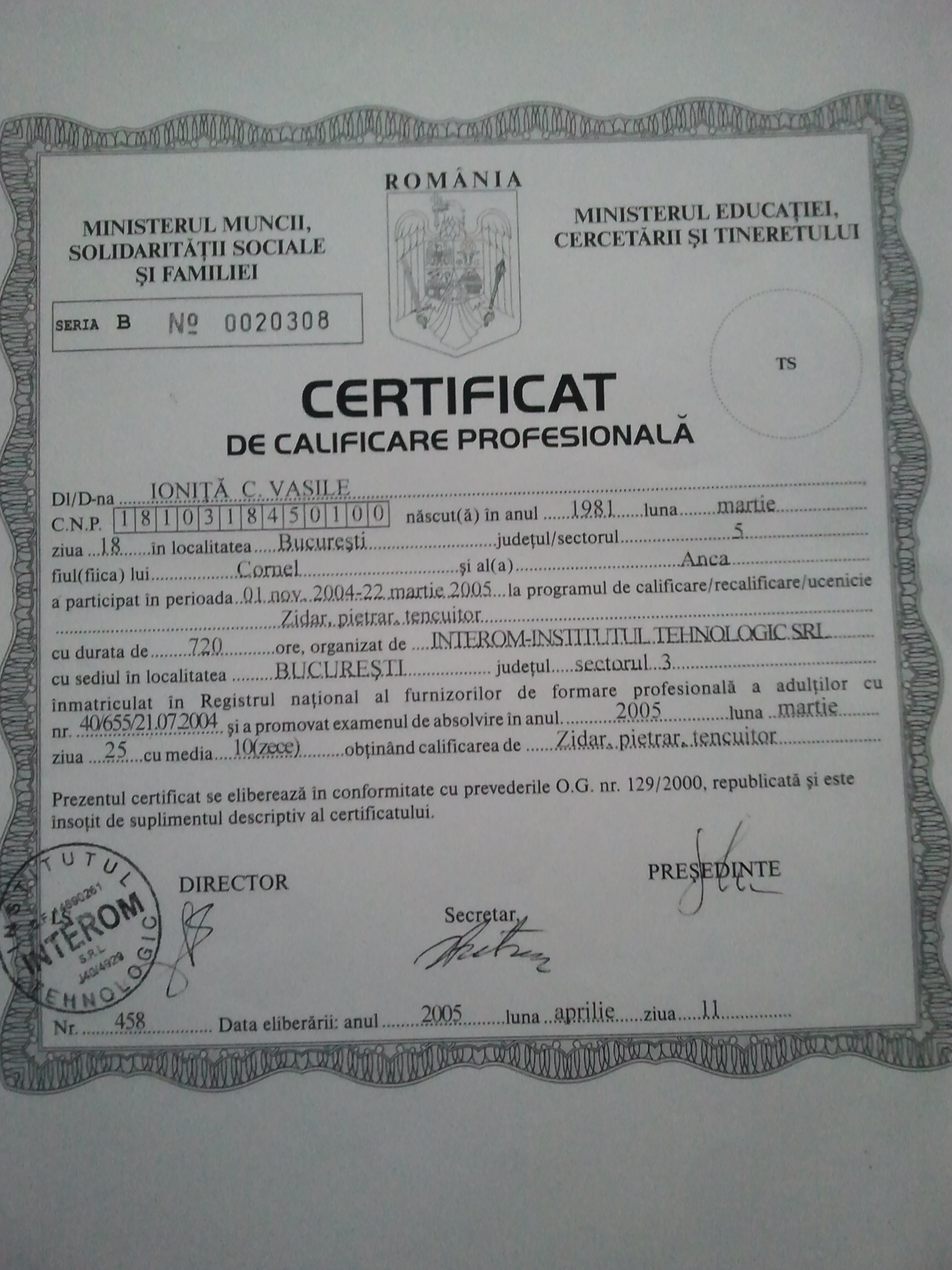 10+ ani experienta ca Constructor acoperisuri, Dulgher, Fierar betonist, Faiantar, Ipsosar, Parchetar, Tapetar, Zidar, Zugrav